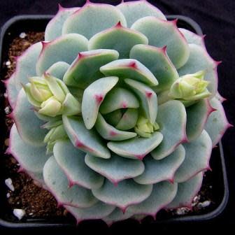 Echeveria is a large genus of succulents in the Crassulaceae family, native from Mexico to north-western South America. The genus is named after the 18th century Mexican botanical artist, Atanasio Echeverría. Many of the species produce numerous offsets, and are commonly known as ‘Hen and Chicks’, which can also refer to other genera such as Sempervivum that are significantly different from Echeveria. They are also often confused with genera such as Aeonium, Graptopetalum and Sedum. Echeveria is regularly crossed with the latter two genera as well as Pachyphytum to create hybrids with the genus names Pachyveria, Sedeveria and Graptoveria. Echeverias are especially well suited to being grown in pots and rockeries which adds to their ease of cultivation. Echeverias are polycarpic, meaning that they may flower and set seed many times over the course of their lifetimes. It is essential in cultivation to use a very porous soil, which will allow quick drainage. Bright light is required to prevent “stretching” of Echeverias. Stretching occurs when a moderately fast growing plant such as an Echeveria, is grown in dim light or over-fertilized, which causes overly lush growth that contributes to weak, pallid plants. Water thoroughly when soil is dry to the touch and let them dry before watering again.