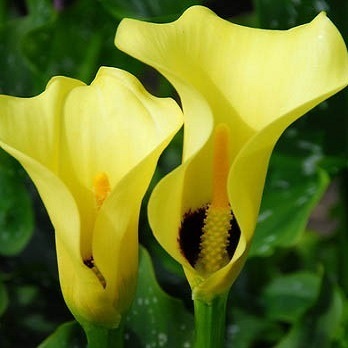 Zantedeschia albomaculata Black Eyed Beauty has yellow flowers with dark throats. Well known as a cut flower especially in graceful, large flower arrangements, what may not be known about this plant is its adaptability. They can be grown successfully in a flower border along with other bulbs and Flowers>Perennial Flower Seeds, but it also grows happily at water’s edge or even in a pot and submersed – pot and all – in the shallow end of a pond. It is endemic to South Africa and its graceful vase like flowers bloom from mid to late summer.