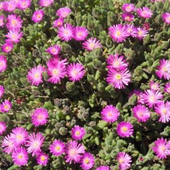 Mesembs is a common popular term used for succulent members of the family Aizoaceae, which are often placed in a separate family of their own, Mesembryanthemaceae. They are sometimes also referred to as vygies, fig-marigolds, ice plants, midday flowers, living stones or flowering stones. They display remarkable variation in leaf architecture, flower colour and form as well as fruit structure. Therefore these plants fascinate many plant lovers of all ages and have become popular amongst collectors of succulent plants. They make excellent potted plants. Drosanthemum is a genus of succulent plants in the ice plant family native to the winter-rainfall regions of southern Africa. Most species bear colourful flowers. The name Drosanthemum means Dew-flower in Greek, and refers to the characteristic shiny translucent papillae, which cover the succulent leaves and flower buds. There are over 110 species of Drosanthemum found in the arid areas of South Africa and neighbouring Namibia. The Drosanthemum genus is perhaps the most popular and spectacular of all garden mesembs. Few other plants can match the glowing intensity of a stand of these mesembs in full flower.