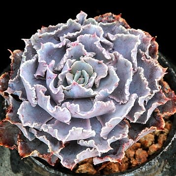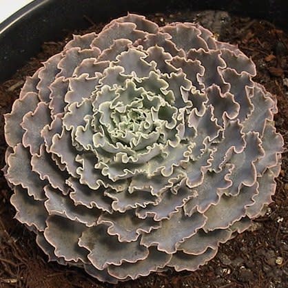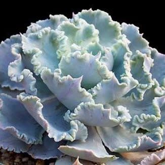 Echeveria shaviana has pale powder blue foliage with very crinkly edges. It’s used by hybridizers to contribute this feature to its offspring, sometimes with striking results; in other efforts, a surprise. In late summer appear the branched stems of pink flowers that are yellow in the interior. Plant it in full sun to light shade (requires some shade in hot interior climates) in a well-drained soil. This plant is native to the mountainous areas in northern Mexico (Tamaulipas, Nuevo Leon). This plant is the pollen parent for Don Worth’s incredible hybrid Echeveria ‘Afterglow’ (E. cante x E. shaviana). It will reach up to 15cm across but is slow to achieve that size. Preferred conditions are bright light with well-drained soil. Use Echeveria shaviana as an accent planted singly in a collection, or in a group container to show off the myriad variations of colour and form in Echeveria.