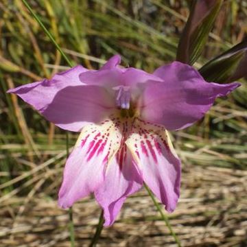Gladiolus blommesteinii is a spring flowering South African endemic perennial species found in the Western Cape province. It is found on sandstone slopes in fynbos. Blooms are produced in early spring during the months of August to October and grows from 30 to 60 cm in height. Flowers are in a one to four flowered inclined spike, mauve or pink with dark longitudinal streaks on the lower tepals.