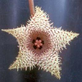 Huernia is a member of the Apocynaceae family. Sixty-four species of Huernia are found in eastern and southern Africa, Ethiopia and Arabia. They are low (10 cm) perennials with angular fleshy stems armed with large teeth. The grey-green stems branch from the base forming large clumps. Attractive flowers, 2-3 cm in diameter with short stalks, are produced freely in the summer and autumn from the base or middle of the stems. The flowers which may be red, yellow or brown and often spotted, have a 5-angled margin or are 5-lobed with a characteristic small lobe in the angle between the main lobes. The flowers produce a smell of carrion, the strength and quality of which varies considerably between different species.