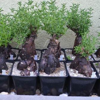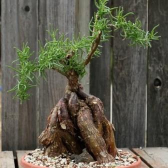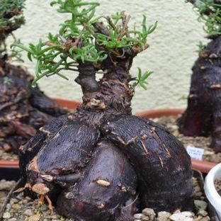 Mestoklema tuberosum is a shrubby “Mesemb” (ice plant relative) to 45-60cm tall from the arid Northern Cape of South Africa and into Namibia. It develops a miniature tree-like habit with a gnarled caudex that has smooth reddish bark and small yellow-orange flowers appear in spring through summer. Plant it in full sun or bright shade. Very dry growing, even in a container and cold tolerant. This plant makes a very showy container plant, especially once the tuberous roots develop. Grow with tuberous roots in soil to develop size, then lift plant and replant with roots exposed. Keep twiggy stems trimmed for best look.