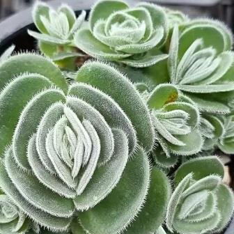 Crassula tomentosa, commonly known as Woolly Crassula, is a perennial or biennial clump forming succulent, forming compact rosettes of greyish green, hairy leaves. Crassula tomentosa flowers early to mid-summer producing white to yellowish flowers on erect flower stems up to 60cm tall. It is monocarpic meaning that its individual rosettes flower only once in their life, set seeds and die and then replaced by new rosettes. Crassula tomentosa is a very variable species with many slightly different forms. They are somewhat hardy, tolerating temperatures as low as negative 3.9 °C.